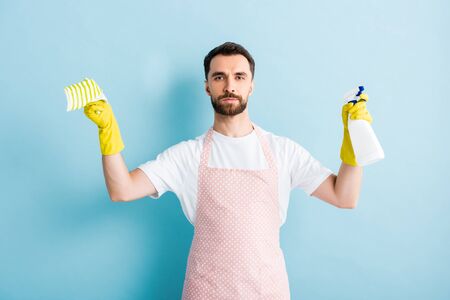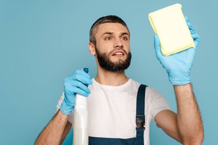 cleaner in uniform and rubber gloves using detergent and sponge on blue background