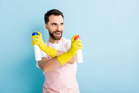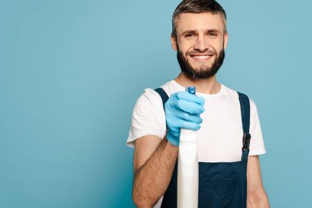 happy cleaner in uniform and rubber gloves holding spray detergent on blue background