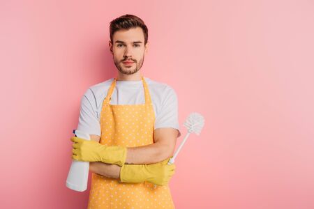 serious young man in apron and rubber gloves holding spray bottle and plunger on pink background