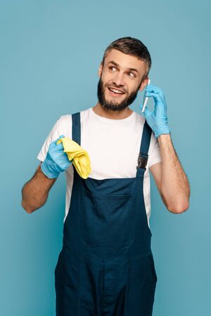 happy cleaner in uniform and rubber gloves with rug talking on smartphone isolated on blue