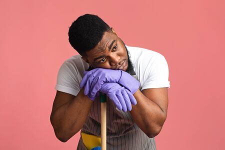Exhausted Black Guy Leaning On Mop Handle, Resting Head On Hands Tired After Cleaning, Standing Over Pink StudioBackground With Free Space Done