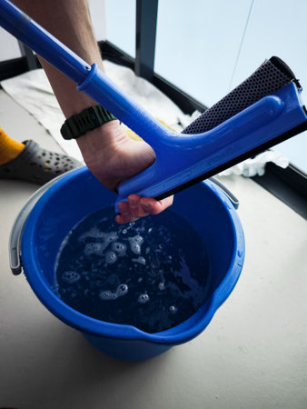 Close up of a window cleaner squeezing excess water from a squeegee into a blue bucket, ensuring efficient and mess free cleaning