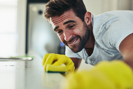 cheerful man in yellow gloves cleans the kitchen counter with a green spray and cloth, smiling