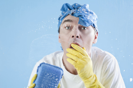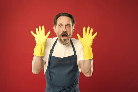 Shocking results. On guard of cleanliness. Cleaning service and household duty. Lot of work. Man in apron with gloves cleaning. Cleaning day today. Bearded guy cleaning home. Bearded worker