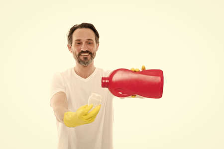 Cleanup concept. The key to cleanliness in house. Doing laundry. Product for cleaning. Man rubber gloves hold plastic bottle liquid soap chemical cleaning agent. Bearded mature guy cleaning home