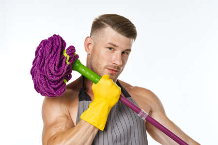 Where have you been. husband cleaning house. Housework and domestic duty. Male janitor with cleaning supply. sweeping the floor. man cleaner. bearded man cleaning with mop. Janitor in gloves
