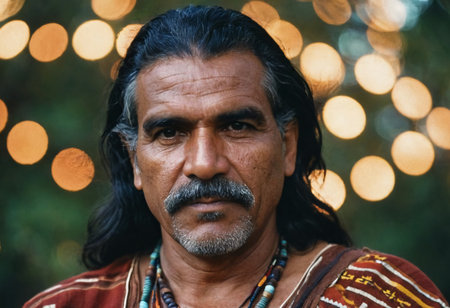 A knowledgeable Aboriginal man stands confidently, his expressive eyes telling stories of heritage and tradition.