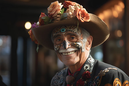 An AI generated illustration of an elderly man wearing Mexican Day of the Dead clothing and celebrating the traditional holiday