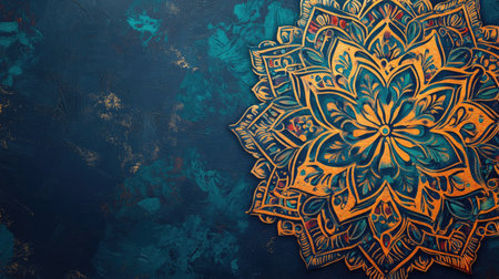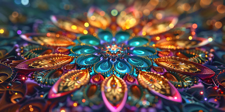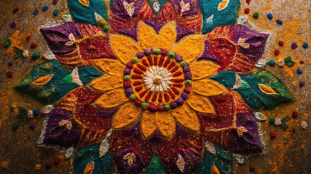 A vibrant and intricate Rangoli design, a traditional Indian art form used for decoration during festivals and special occasions, creating a colorful and auspicious atmosphere.