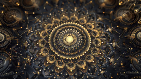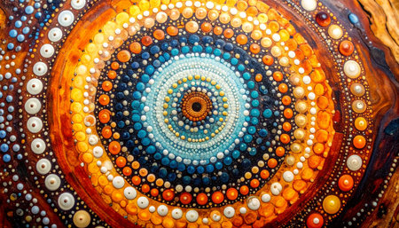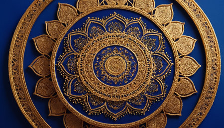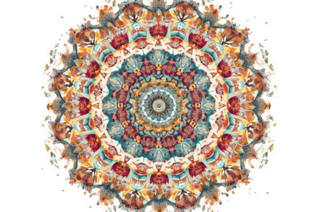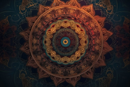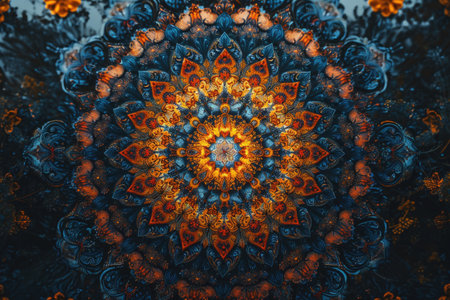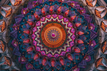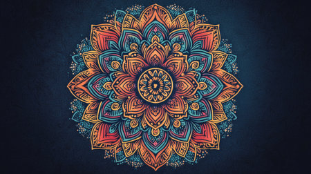 A symmetrical mandala design with vibrant, intricate patterns on a deep, contrasting background.