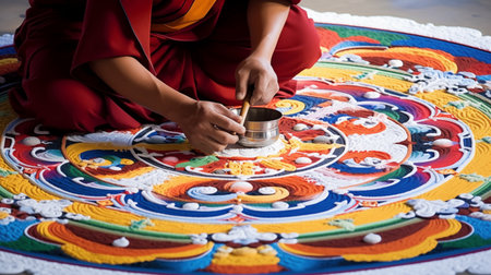 Spiritual rituals mark the dismantling of sand mandalas, symbolizing impermanence, mindfulness, and the cyclical nature of existence.AI Generated