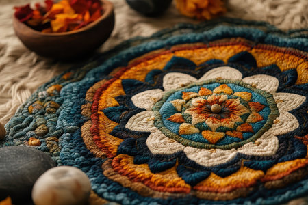 Handcrafted mandala woven from vibrant silk threads, detailed texture