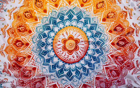 Top view of a vibrant rangoli design with intricate patterns and colorful powders on a surface