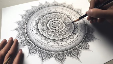 An extreme close-up shot captures the detailed, meditative process of drawing a complex geometric ma