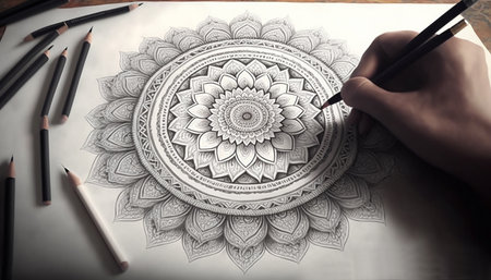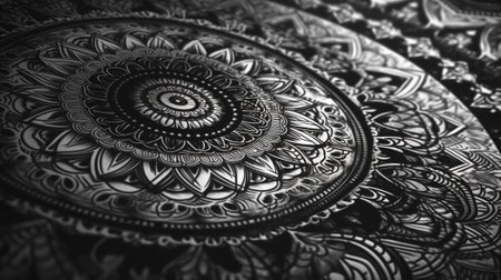 This intricate mandala pattern, meticulously drawn with fine black ink on textured parchment, showcases exceptional artistic detail, perfect for inspiring creativity and representing intricate design.