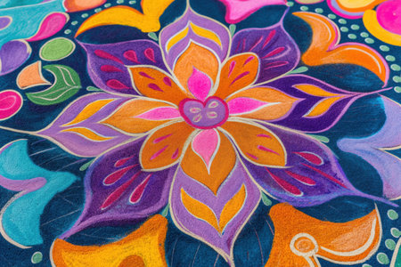 A close-up view of a colorful and intricately designed Rangoli, a traditional Indian art form, showcasing a vibrant floral pattern.