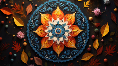 Bright colorful Rangoli illustration with autumn leafs and flowers. Postcard view
