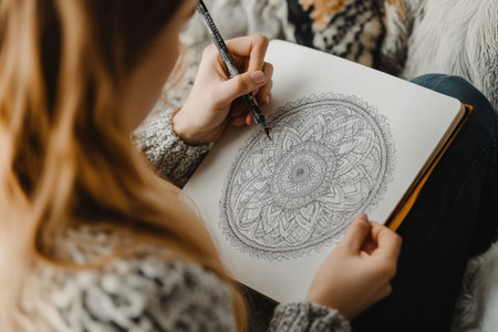 A woman is focused on drawing detailed mandala patterns in her sketchbook at home in a relaxed atmosphere.
