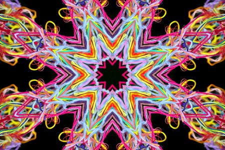 A complex symmetrical kaleidoscope pattern formed by glowing blue, green, and purple lights, creating a mesmerizing abstract design.