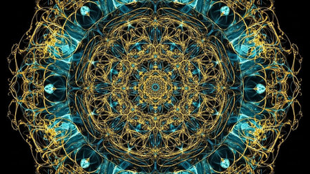 A complex and symmetrical fractal mandala pattern in golden yellow and teal blue against a black background, featuring intricate swirling lines and glowing elements.