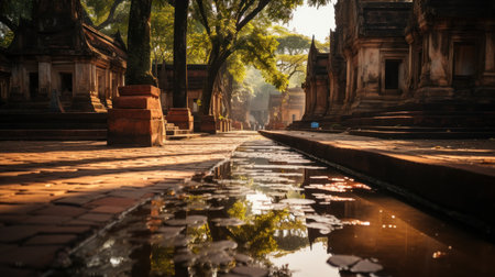 Shady trees and dappled light at dusk at Kuthodaw Pagoda, a Buddhist stupa at the foot of Mandalay Hill that holds the world's largest book, in Mandalay in Myanmar, formerly known as Burma