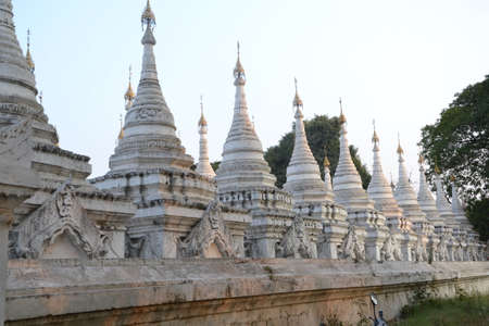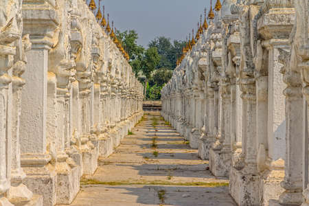 A row of ancient white stupas of Kuthodaw Pagoda in Mandalay