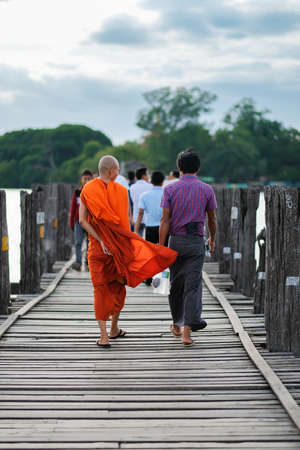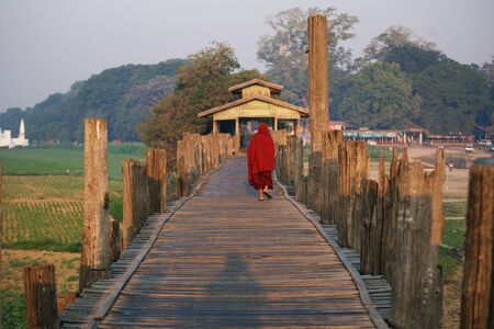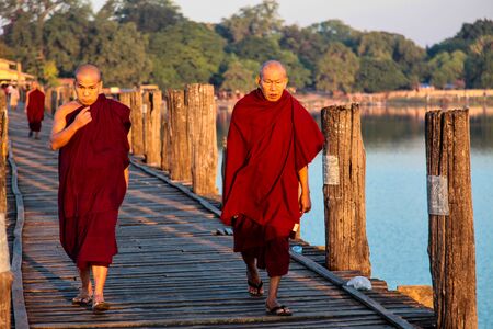 Mandalay, Myanmar - Nov 12, 2019: Monks at U Bein bridge in Amarapura,Mandalay Myanmar