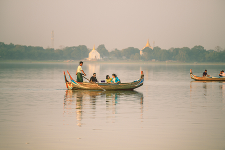 Mandalay, Myanmar - 3 February 2017: Tourists watching the sunset on tradition boast at Taungthaman Lake Amarapura. U Bein Bridge, Mandalay