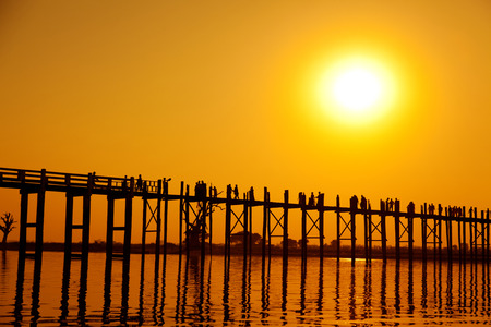 Unidentified people walk on U Bein bridge at sunset in Myanmar. U Bein bridge is the longest teak bridge in the world, Amarapura, Myanmar
