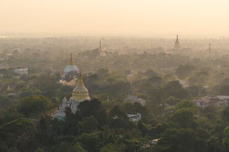 MANDALAY, MYANMAR - DECEMBER 1, 2016: Golden Pagodas in Sagaing hill, Burma. Copy space for text