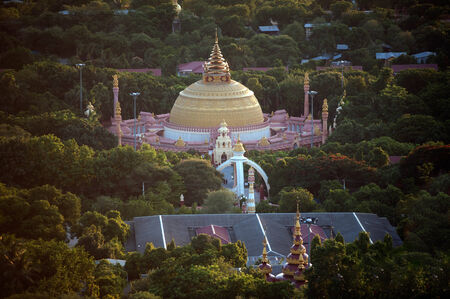 Buddhist temple and pagoda in Sagaing city at sunset, Mandalay in Myanmar, Asia