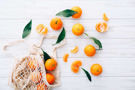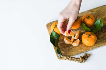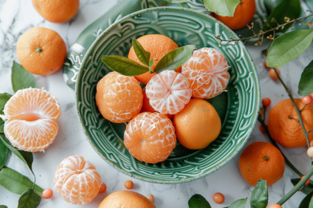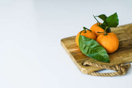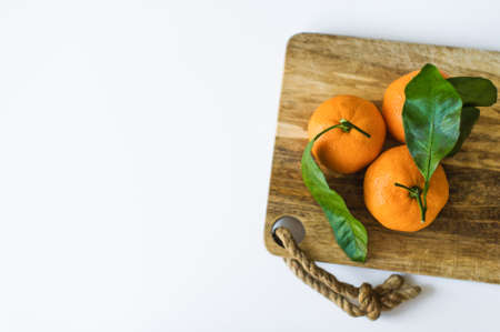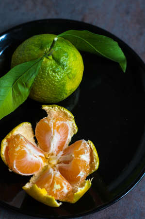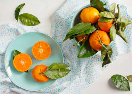 Tangerines with leaves on plate - citrus fruits and healthy eating flatlay styled concept