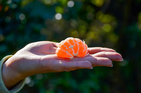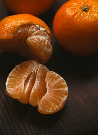Tangerine segments peeled and ready for eating, providing a healthy and sweet citrus snack on a dark wooden table