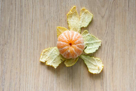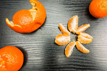 A star or flower arranged from a piece of peeled mandarin on the table. View from above.