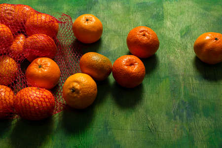 Broken mesh bag of oranges on an old wooden background in shades of green with oranges scattered over it. Mediterranean diet concept