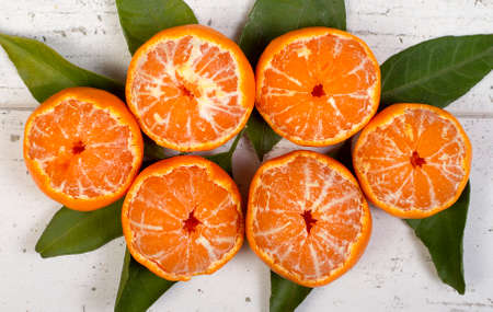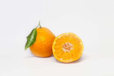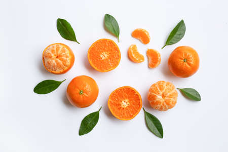 White background with pieces of tangerines and whole tangerines sharpness in the foreground