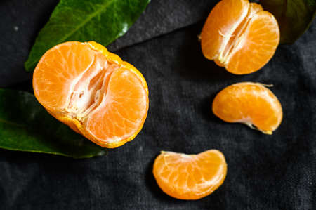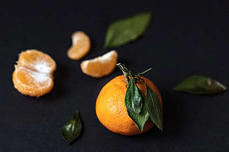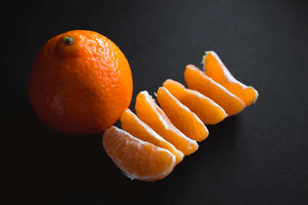 orange fresh juicy tangerine slices on the background of glossy black glass close-up