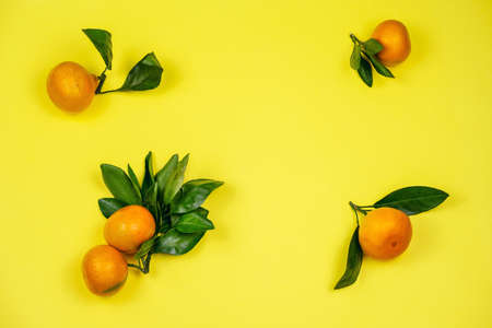 Fresh tangerines on a white table. Side view. Yellow background with copy space. High quality photo