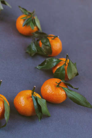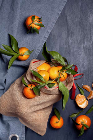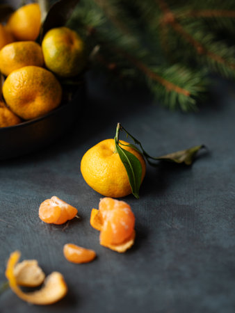 Tangerines with green leaves on a dark blue background with fir branches. A concept featuring fresh and healthy citrus fruits for the winter season in a rustic style. Copy space.