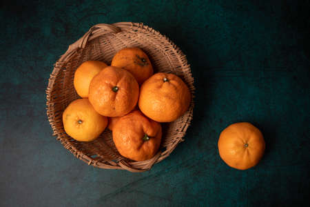 Basket of Tangerines on a wooden table. Delicious and beautiful Tangerines. Citrus background. Mandarins Tangerine Closeup. Rustic style