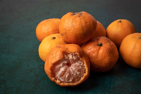 Peeled without skin Oranges tangerines or mandarins clementines, citrus fruits on a dark background