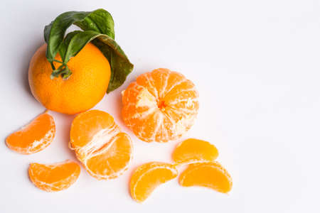 Half peeled tangerine and three tangerine wedges on a white background. Isolate. Life style. Clos ap. Horizontal photo.