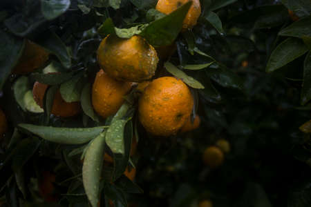 Detail of ripe tangerines for consumption on the tree with green leaves.