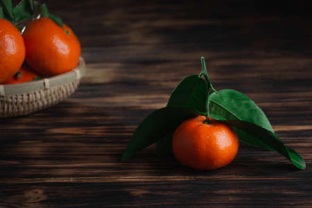 Fresh organic tangerine fruits on rustic wooden table and copyspace