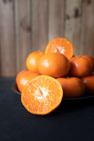 Two fresh mandarin citrus fruits in wooden plate on black grunge background. Winter time fruits. Top view, copy space.