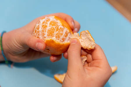 Peeled tangerine on a turquoise background. Mandarin fruit without skin. Healthy food, detox. Close up.