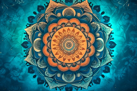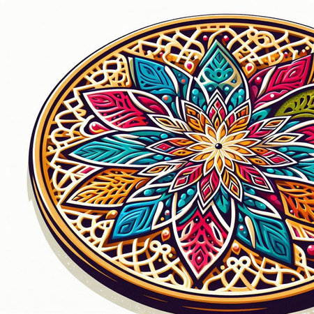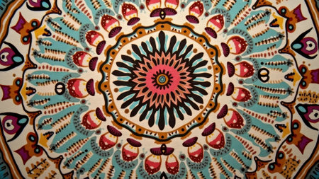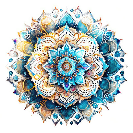 Vibrant and detailed mandala pattern, featuring intricate geometric shapes and floral motifs, evoking a sense of spirituality and tranquility