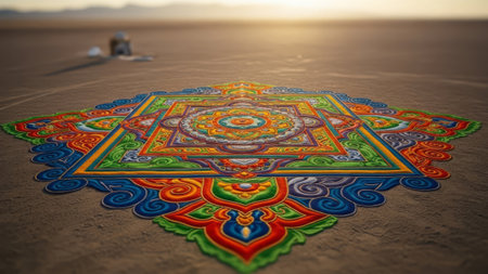 Intricate mandala art on desert salt flats, bright colors, sunset