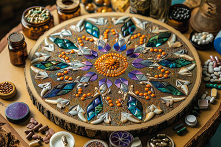 A wooden table covered with a variety of objects, showcasing a diverse assortment of items, An intricate mandala using symbols of opioids and their effects, AI Generated