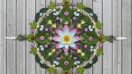 A vibrant and intricate mandala design crafted using colorful flowers, petals, and leaves. This traditional Indian art form holds deep cultural and spiritual significance.